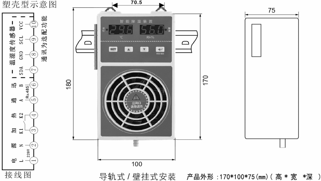產(chǎn)品簡介 / Introduction概述:智能型除濕裝置是采用半導(dǎo)體制冷除濕方式,主動將密閉空間的潮濕空氣在風(fēng)扇的作用下吸入除濕風(fēng)道,空氣中的水汽經(jīng)過半導(dǎo)體制冷機構(gòu)后冷凝成水,再通過導(dǎo)水管排除柜體,可以達到很好的除濕效果。降溫型:當F01設(shè)置0時為降溫型,當環(huán)境濕度高于濕度最大值(濕度設(shè)定值)期間除濕裝置會自動開啟除濕;當環(huán)境濕度低于濕度最低值(濕度設(shè)定值減去濕度回差值)停止除濕。當環(huán)境溫度高于設(shè)定溫度最高值(溫度設(shè)定值),風(fēng)扇散熱開始啟動,當溫度低于設(shè)定溫度值(溫度設(shè)定值減去溫度回差值)降溫風(fēng)扇停止工作。升溫型:當F01設(shè)置1時為升溫型,當環(huán)境溫度低于設(shè)定溫度最低值(溫度設(shè)定值),加溫開始啟動,當溫度高于最高溫度值(溫度設(shè)定值加上溫度回差值)加溫停止。如同時需冷凝除濕,設(shè)置濕度值,當環(huán)境濕度高于設(shè)定濕度最大值(濕度設(shè)定值)期間除濕裝置會全自動開啟除濕;當環(huán)境濕度低于濕度最低值(濕度設(shè)定值減去濕度回差值)停止除濕;當手動開啟除濕功能時,除濕裝置將一直保持除濕功能,直至手動關(guān)閉除濕功能。防結(jié)霜結(jié)冰功能:實時監(jiān)測冷凝面工作面溫度,防止冷凝面溫度過低在除濕工作的時候結(jié)冰結(jié)霜,影響排水效果空氣循環(huán)功能:柜內(nèi)空氣靜止狀態(tài)下各個部位的溫度不同濕度不同,除濕器提供柜內(nèi)空氣循環(huán)功能,使柜內(nèi)各個方位的溫度濕度更加平均,能更加有效的監(jiān)測柜內(nèi)空氣中的濕度和環(huán)境溫度。技術(shù)參數(shù):