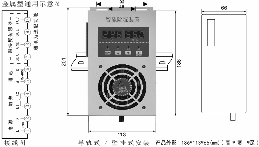 產(chǎn)品簡介 / Introduction概述:智能型除濕裝置是采用半導(dǎo)體制冷除濕方式,主動將密閉空間的潮濕空氣在風(fēng)扇的作用下吸入除濕風(fēng)道,空氣中的水汽經(jīng)過半導(dǎo)體制冷機構(gòu)后冷凝成水,再通過導(dǎo)水管排除柜體,可以達到很好的除濕效果。降溫型:當F01設(shè)置0時為降溫型,當環(huán)境濕度高于濕度最大值(濕度設(shè)定值)期間除濕裝置會自動開啟除濕;當環(huán)境濕度低于濕度最低值(濕度設(shè)定值減去濕度回差值)停止除濕。當環(huán)境溫度高于設(shè)定溫度最高值(溫度設(shè)定值),風(fēng)扇散熱開始啟動,當溫度低于設(shè)定溫度值(溫度設(shè)定值減去溫度回差值)降溫風(fēng)扇停止工作。升溫型:當F01設(shè)置1時為升溫型,當環(huán)境溫度低于設(shè)定溫度最低值(溫度設(shè)定值),加溫開始啟動,當溫度高于最高溫度值(溫度設(shè)定值加上溫度回差值)加溫停止。如同時需冷凝除濕,設(shè)置濕度值,當環(huán)境濕度高于設(shè)定濕度最大值(濕度設(shè)定值)期間除濕裝置會全自動開啟除濕;當環(huán)境濕度低于濕度最低值(濕度設(shè)定值減去濕度回差值)停止除濕;當手動開啟除濕功能時,除濕裝置將一直保持除濕功能,直至手動關(guān)閉除濕功能。防結(jié)霜結(jié)冰功能:實時監(jiān)測冷凝面工作面溫度,防止冷凝面溫度過低在除濕工作的時候結(jié)冰結(jié)霜,影響排水效果空氣循環(huán)功能:柜內(nèi)空氣靜止狀態(tài)下各個部位的溫度不同濕度不同,除濕器提供柜內(nèi)空氣循環(huán)功能,使柜內(nèi)各個方位的溫度濕度更加平均,能更加有效的監(jiān)測柜內(nèi)空氣中的濕度和環(huán)境溫度。技術(shù)參數(shù):